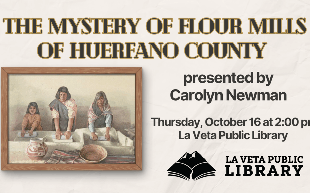 Join us at the La Veta Public Library to kickoff our programming season with presenter Carolyn Newman. Come hungry for history and leave with a story to tell about the flour mills of Huerfano County! Light refreshments provided.