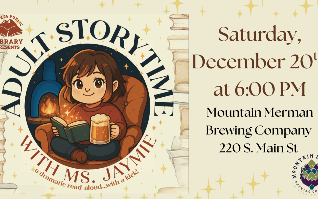 Saturday, December 20 at 6:00 PM – Join the La Veta Public Library at the Mountain Merman Brewing Company for Adult Storytime with Ms. Jaymie! This unique evening pairs dramatic read-alouds of beloved holiday classics—with drink and snack specials for a cozy, festive experience with a kick.