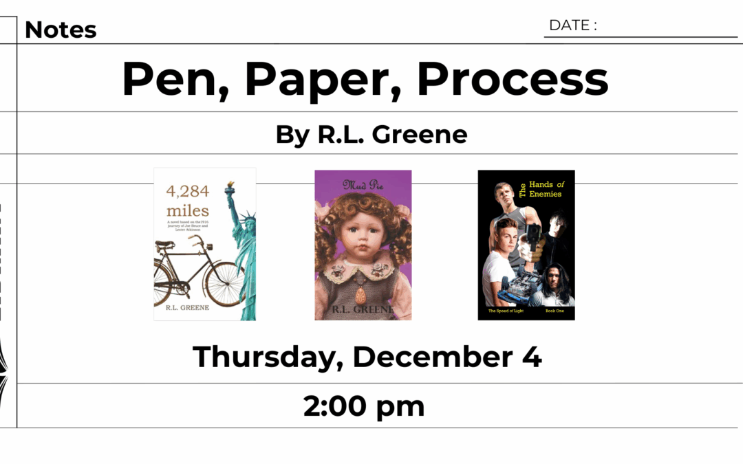 Thursday, December 4 at 2:00 PM Join us for a discussion on writing and the creative process with local author R.L. Greene. Greene’s works include “4,284 Miles”, “Mud Pie”, and the “Speed of Light series”—all recognized as finalists or semifinalists in International Book Competitions.