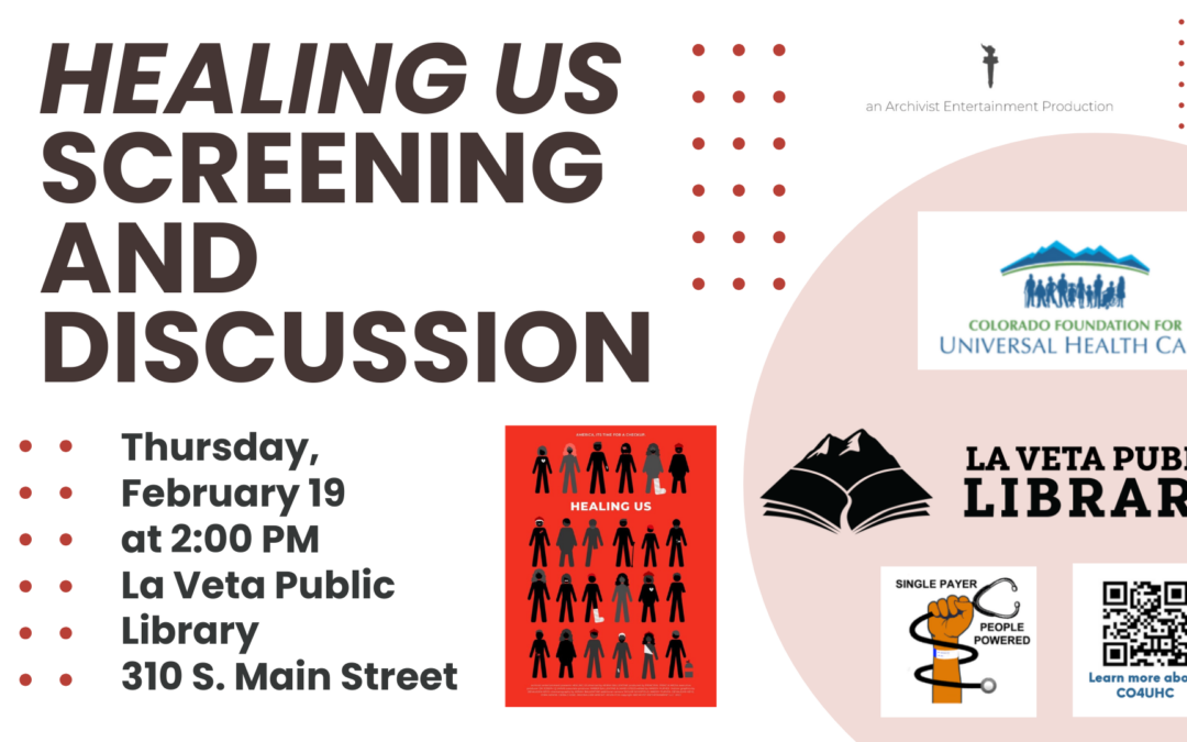 Thursday, February 19 at 2:00 PM – Join Dr. Joseph Q. Jarvis, MSPH, for a brief introduction to the documentary film Healing US, followed by discussion. Local contacts: Jeanne Schwarz (303-748-0614) and Monica Birrer (719-859-1033). Light refreshments provided.