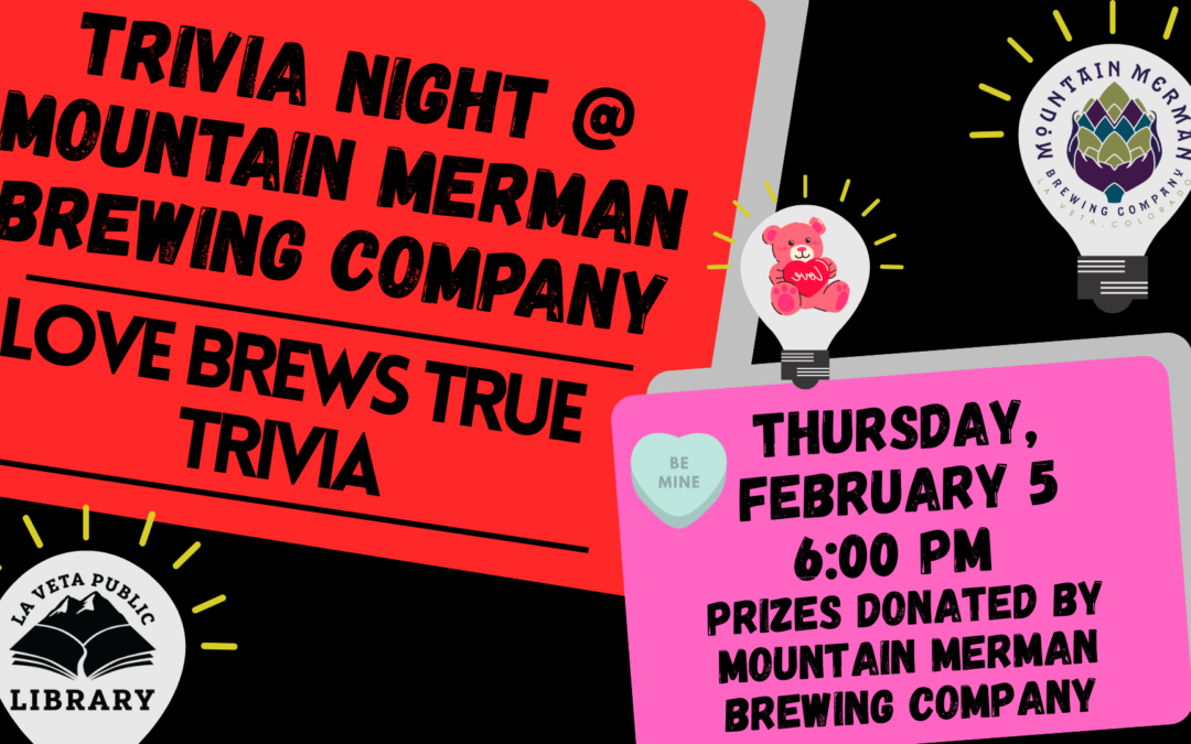 Thursday, February 5 at 6:00 PM “Love is brewing!” Join La Veta Public Library at Mountain Merman Brewing Company for a romantic night of Love Brews True Trivia! No electronic devices allowed—this will result in immediate team disqualification. There is no charge to participate in trivia. Great prizes donated by Mountain Merman Brewery! Want to host a library event at your business? We want to hear from you! info@lvpl.org