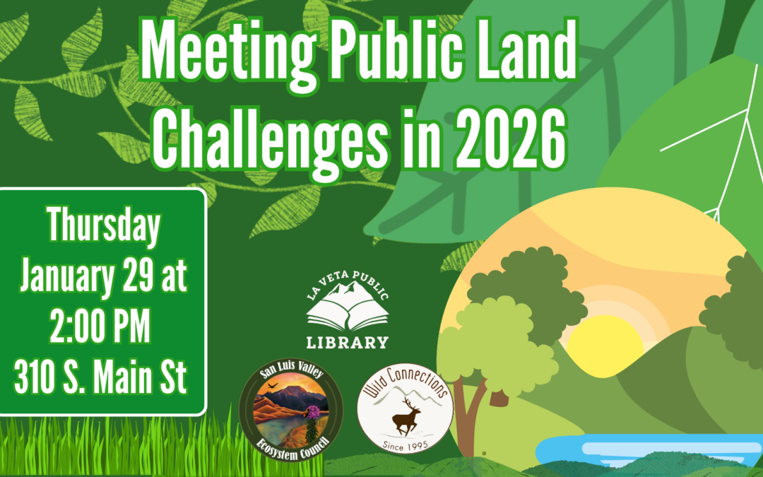 Thursday, January 29 at 2:00 PM Join the SLV Ecosystem Council and Wild Connections to discuss protecting public lands through community involvement, science-based advocacy, and on-the-ground monitoring. Learn to become a citizen scientist, get outside, and have fun!