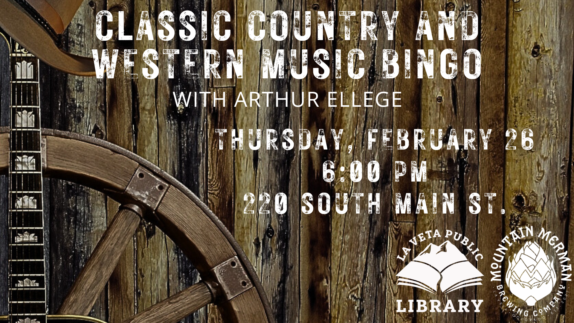 Join La Veta Public Library at Mountain Merman Brewing Company for “Classic Country and Western Music Bingo” with Arthur Ellege! There is no charge to participate. All play is individual. See you at the brewery! Want to host a library event at your business? We want to hear from you! info@lvpl.org