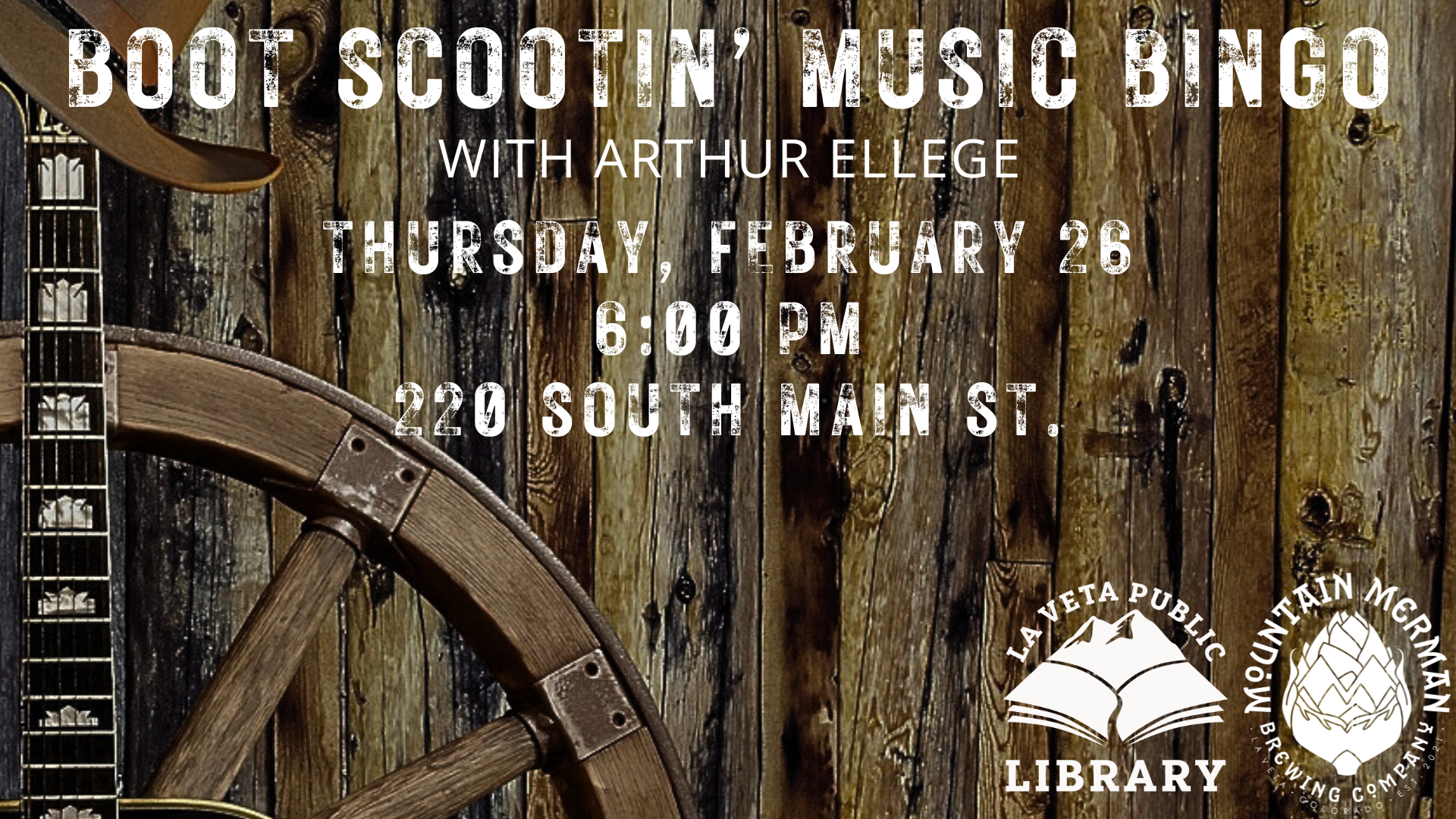 Join La Veta Public Library at Mountain Merman Brewing Company for “Boot Scootin’ Music Bingo” with Arthur Ellege! There is no charge to participate. All play is individual. See you at the brewery! Want to host a library event at your business? We want to hear from you! info@lvpl.org