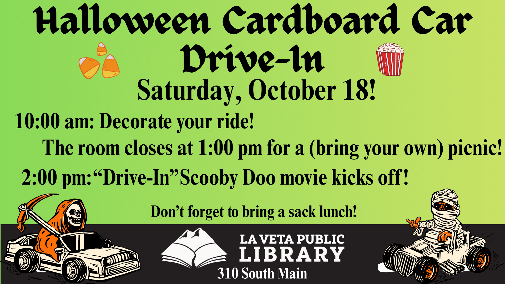 Join us at the La Veta Library for an epic Halloween Movie Drive-in! Build your own cardboard box car and enjoy a spooky movie drive-in style! Don’t forget to bring a sack lunch! Start decorating your rides at 10:00 AM, the room closes at 1:00 PM – the perfect time for a (bring your own) courtyard picnic! – Drive in Scooby Doo Halloween Movie kicks off at 2:00 PM