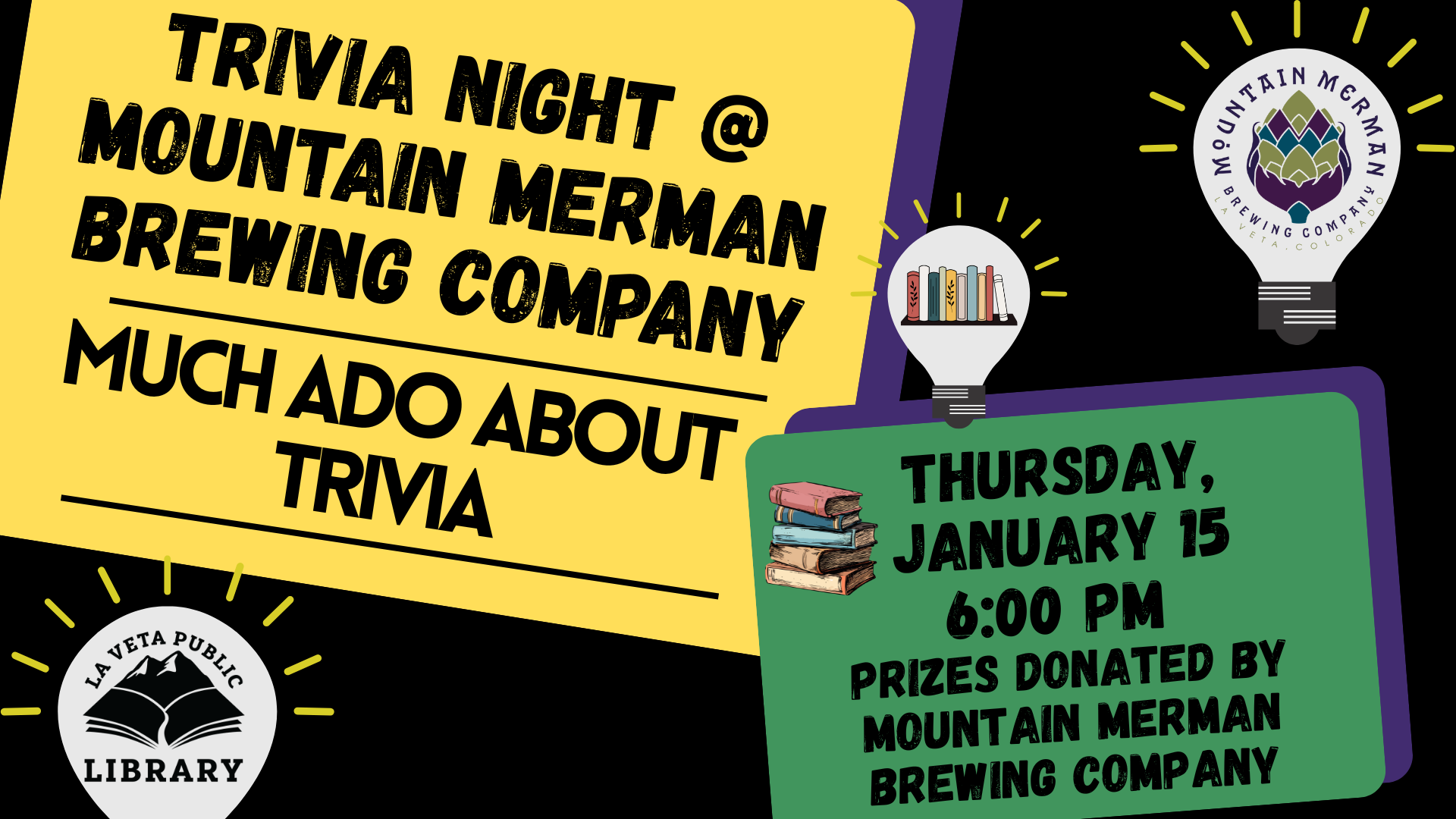 “To read or not to read? That is NOT the question!” – Join La Veta Public Library at Mountain Merman Brewing Company for an enchanting evening of Much Ado About Trivia! No electronic devices allowed—this will result in immediate team disqualification. There is no charge to participate in trivia. Great prizes donated by Mountain Merman Brewery! Want to host a library event at your business? We want to hear from you! info@lvpl.org