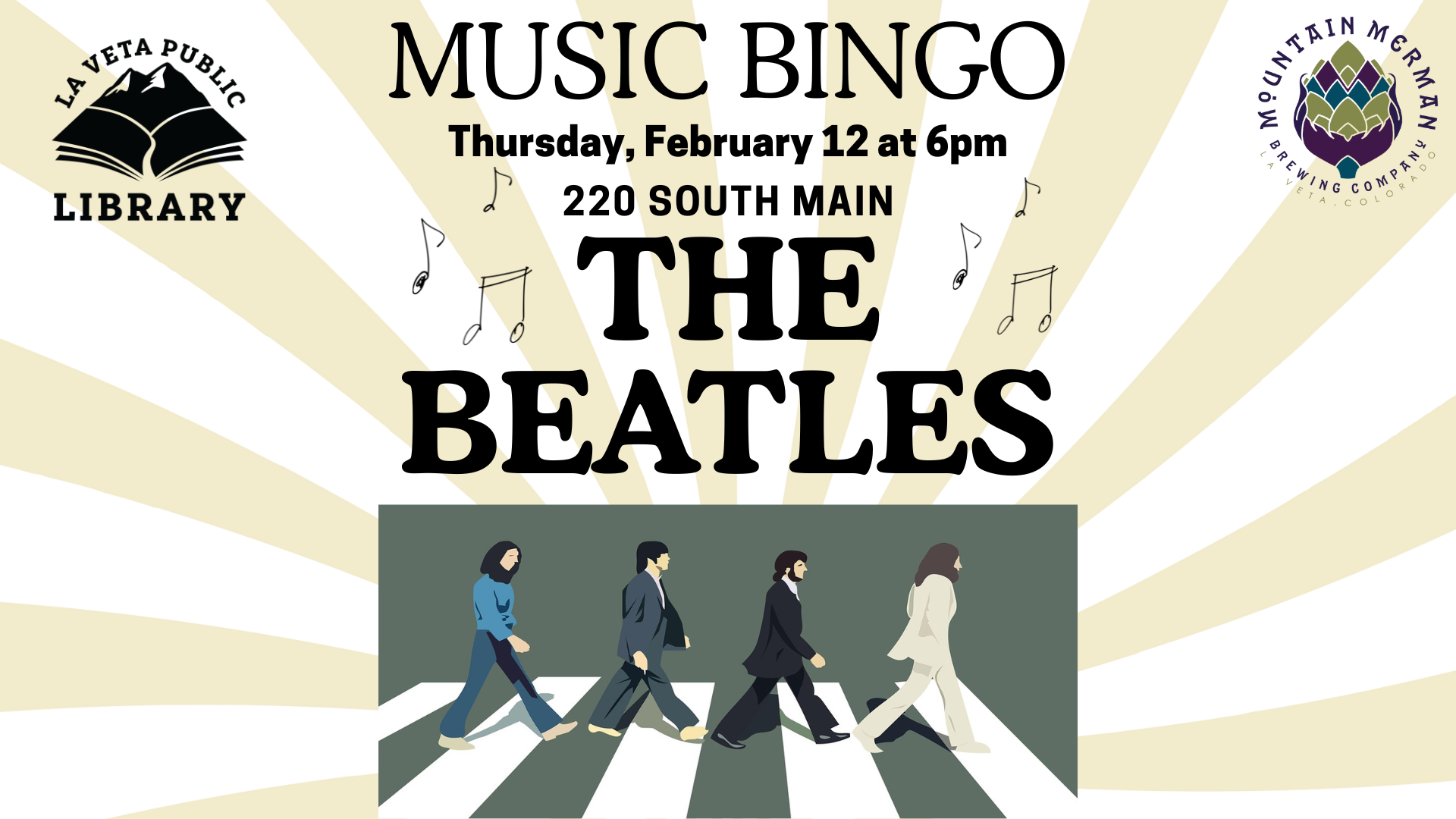 Join La Veta Public Library at Mountain Merman Brewing Company for “Now That’s What I Call Music Bingo: The Beatles”! There is no charge to participate. All play is individual. See you at the brewery! Want to host a library event at your business? We want to hear from you! info@lvpl.org